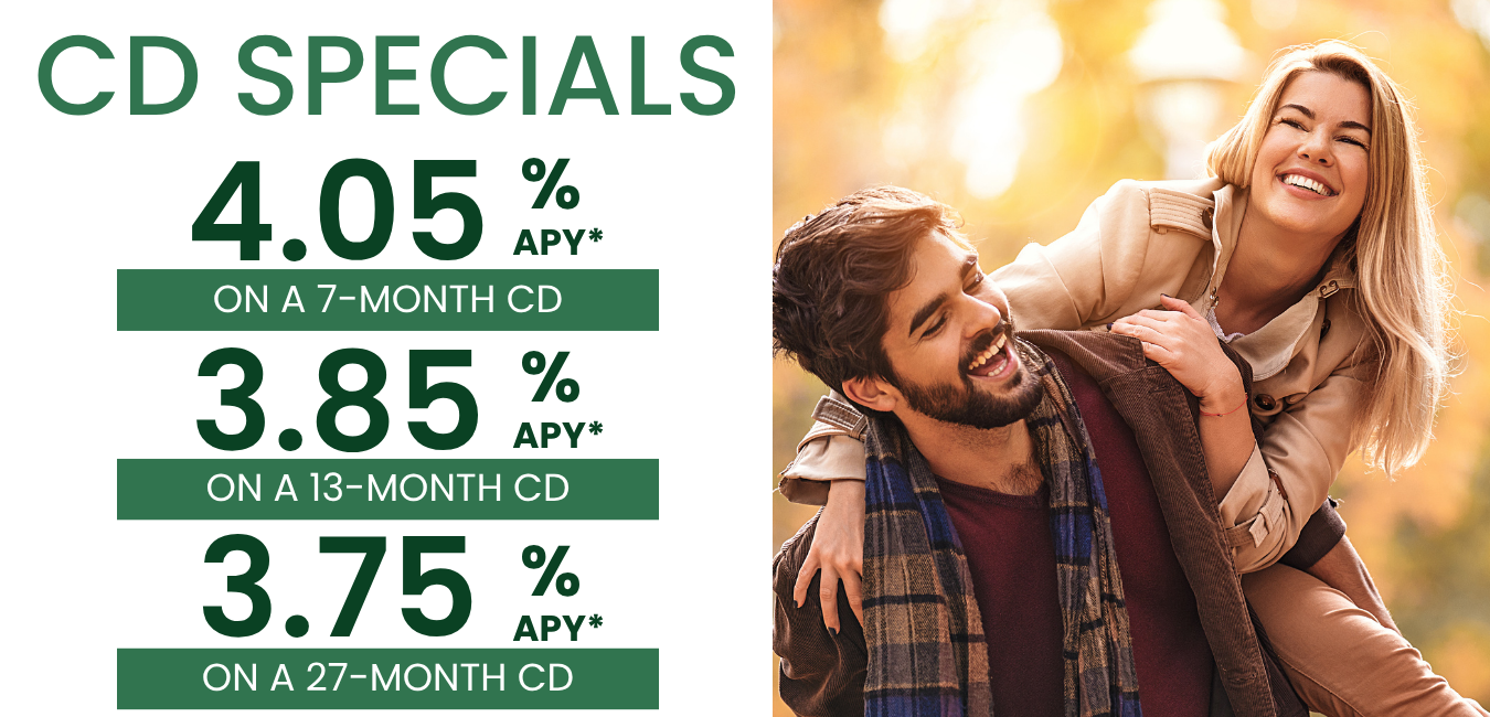 *$500 minimum opening deposit. Annual Percentage Yield (APY) is accurate as of 10/06/2025. Product offerings may be withdrawn at any time. 7-month CD automatically renews to the 6-month rate/term, 13-month CD automatically renews to the 12-month rate/term, and 27-month CD automatically renews to the 24-month rate/term. No early withdrawal penalty during the initial term. If CD is renewed, an early withdrawal penalty will be reinstated along with the new rate and terms. Member FDIC.