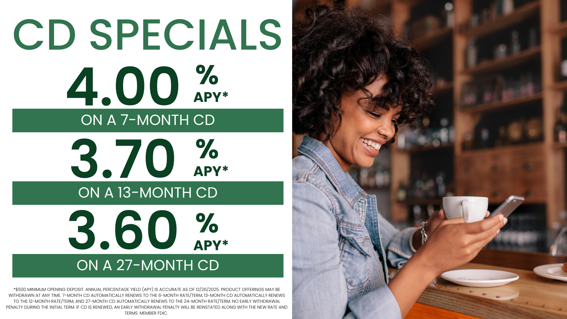 *$500 minimum opening deposit. Annual Percentage Yield (APY) is accurate as of 12/26/2025. Product offerings may be withdrawn at any time. 7-month CD automatically renews to the 6-month rate/term, 13-month CD automatically renews to the 12-month rate/term, and 27-month CD automatically renews to the 24-month rate/term. No early withdrawal penalty during the initial term. If CD is renewed, an early withdrawal penalty will be reinstated along with the new rate and terms. Member FDIC.